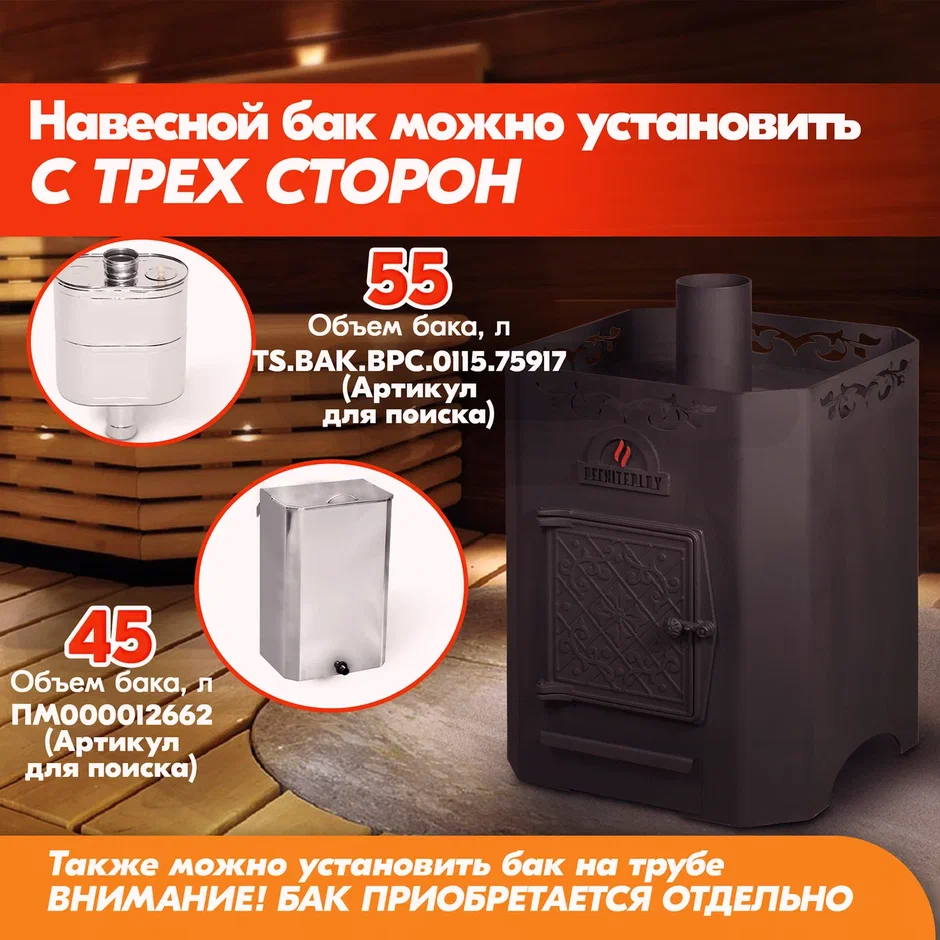На печь для бани на дровах "Дубок" могут быть установлены навесные баки объемом 45 или 55 л.